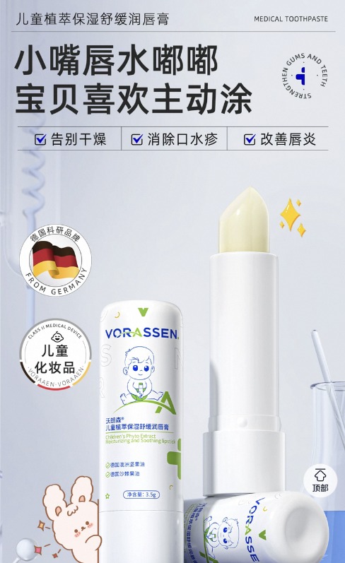 “VORASSEN沃朗森儿童植萃保湿舒缓润唇膏”宣称改善唇炎。