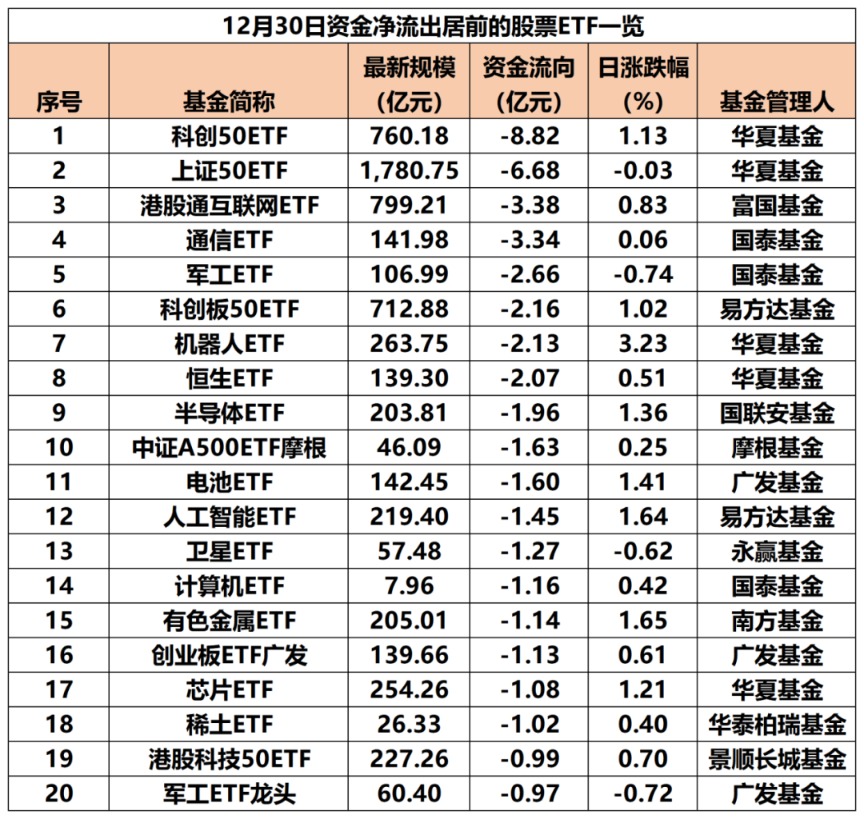 12月30日,全市场股票ETF(含跨境ETF)资金净流入65.81亿元。