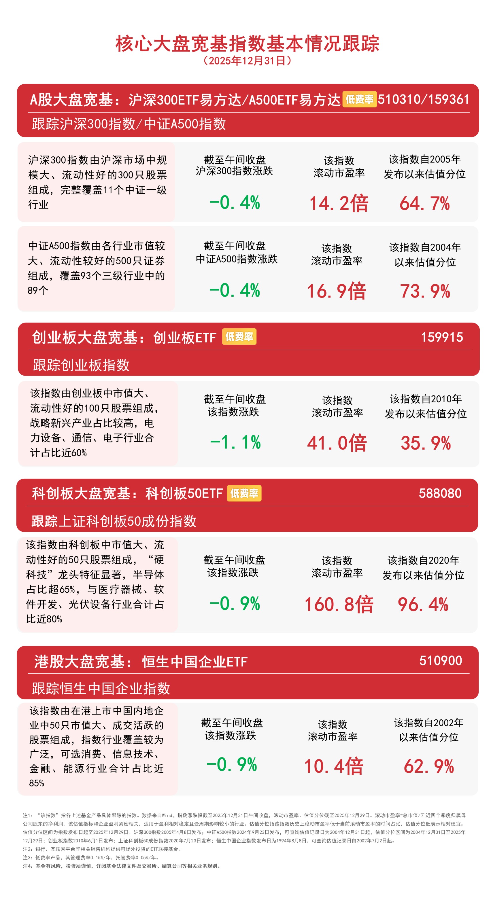 12月31日,市场早盘震荡调整,A股三大指数集体下跌,沪指窄幅震荡跌0.07%。板块题材上,文化传媒、教育、互联网等板块活跃,CPO、GPU、光伏逆变器板块调整;港股回调,军工板块逆势上涨,医药股跌幅居前。截至午间收盘,中证A500指数下跌0.4%,沪深300指数下跌0.4%,创业板指数下跌1.1%,上证科创板50成份指数上涨0.9%,恒生中国企业指数下跌0.9%。