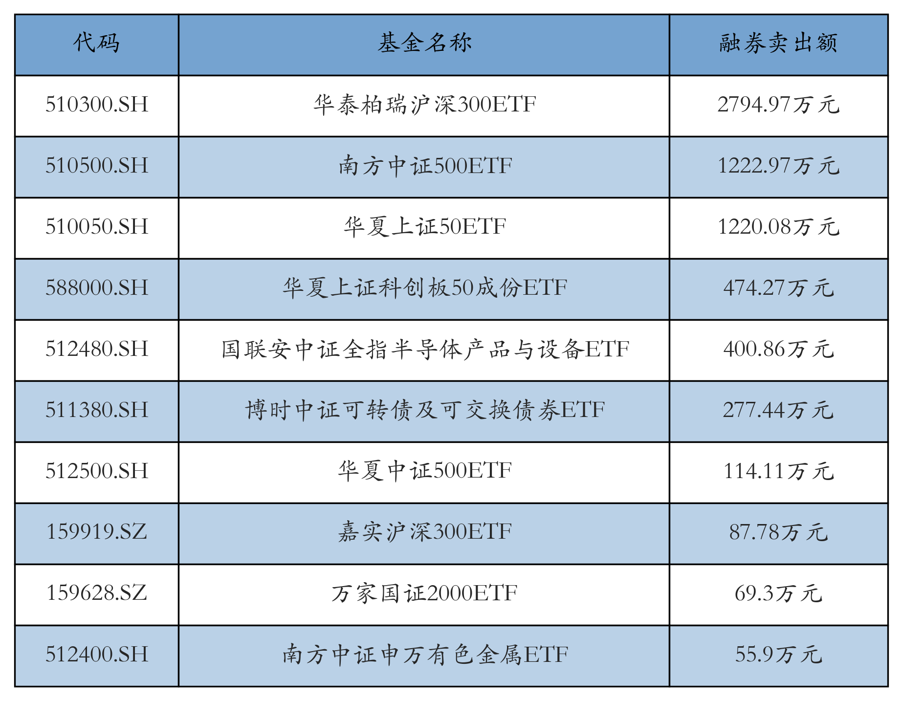 12月30日ETF融券卖出额前三位分别为:华泰柏瑞沪深300ETF(2794.97万元)、南方中证500ETF(1222.97万元)和华夏上证50ETF(1220.08万元),前10具体见下表: