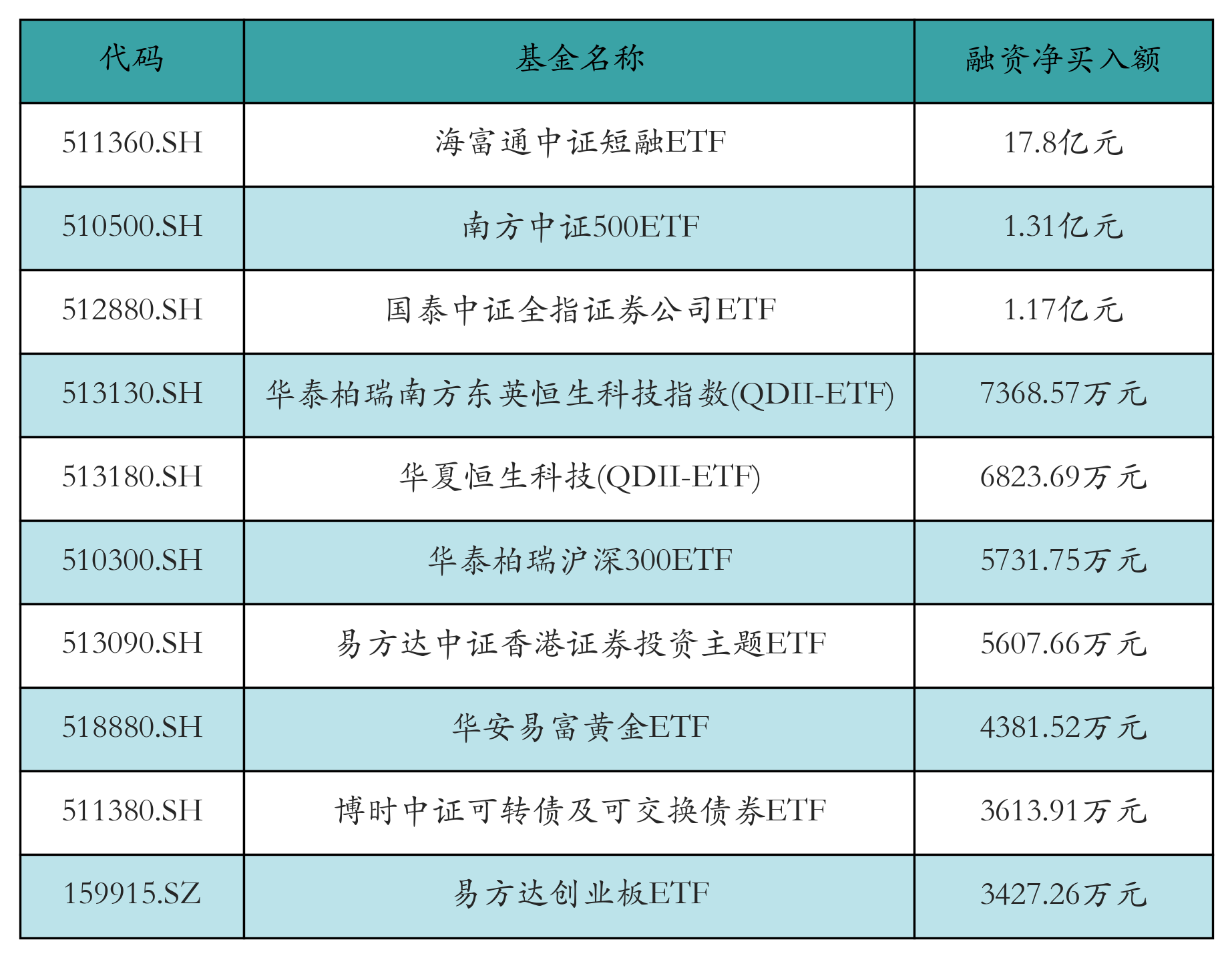12月30日ETF融资净买入额前三位分别为:海富通中证短融ETF(17.8亿元)、南方中证500ETF(1.31亿元)和国泰中证全指证券公司ETF(1.17亿元),前10具体见下表: