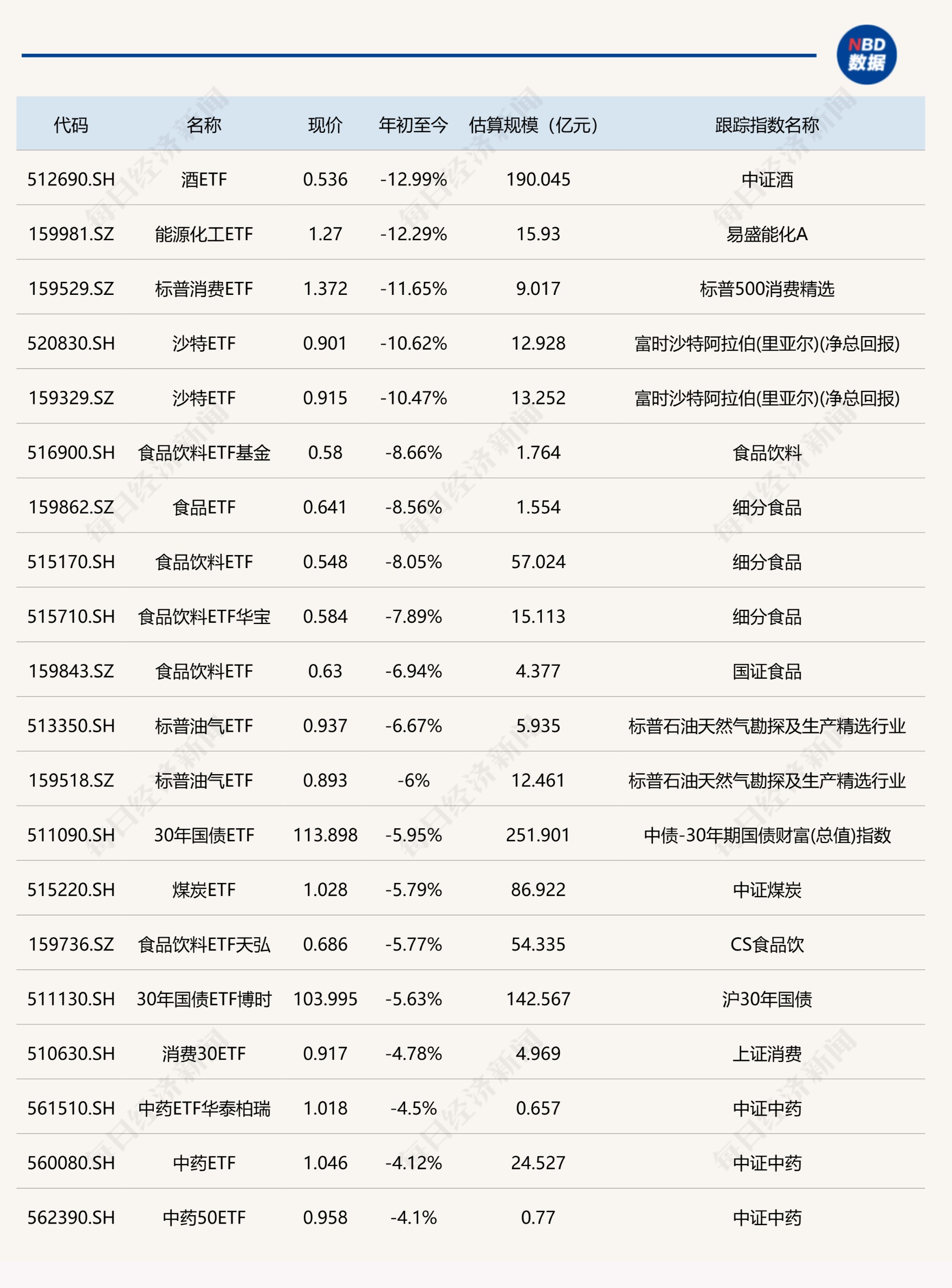 下跌方面,酒ETF、能源化工ETF跌超12%。跨境ETF中的标普消费ETF、沙特ETF跌超10%。
