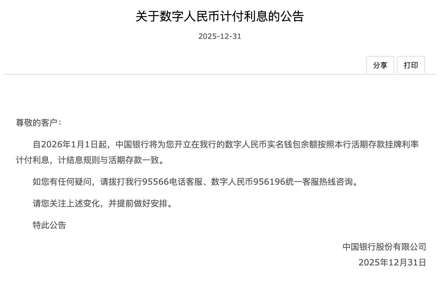 中国银行12月31日发布关于数字人民币计付利息的公告显示,自2026年1月1日起,中国银行将为客户开立在该行的数字人民币实名钱包余额按照活期存款挂牌利率计付利息,计结息规则与活期存款一致。如有疑问,可以拨打该行95566电话客服、数字人民币956196统一客服热线咨询。