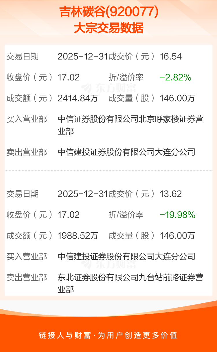 2025年12月31日,吉林碳谷发生2笔大宗交易,共成交292.00万股,成交金额4403.36万元,占其流通市值比例为0.82%。