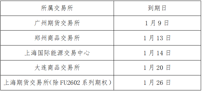 根据大连商品交易所、郑州商品交易所及广州期货交易所相关规定,不允许自然人交易者(以下简称自然人)持仓进入交割月,1月30日为相关品种2602合约自然人最后交易日。