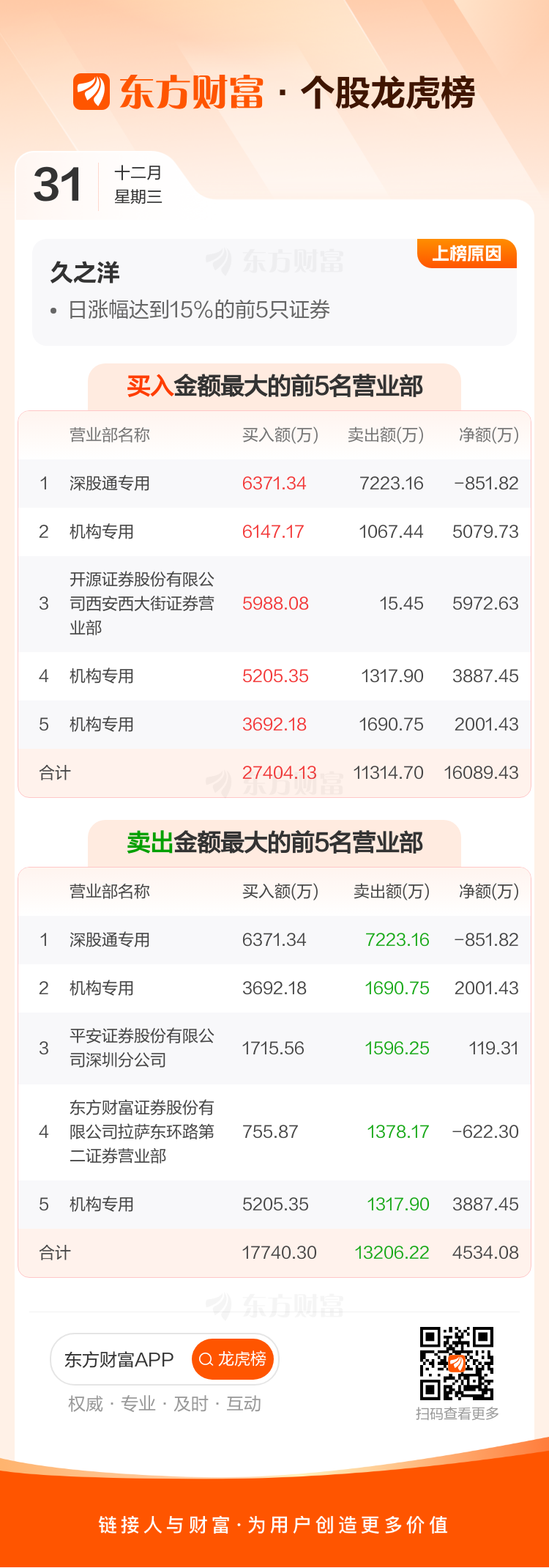 交易所2025年12月31日公布的交易公开信息显示,久之洋因成为日涨幅达到15%的前5只证券上榜。久之洋当日收报80.7元,涨跌幅20.00%,偏离值20.00%,换手率14.27%,成交额18.96亿。