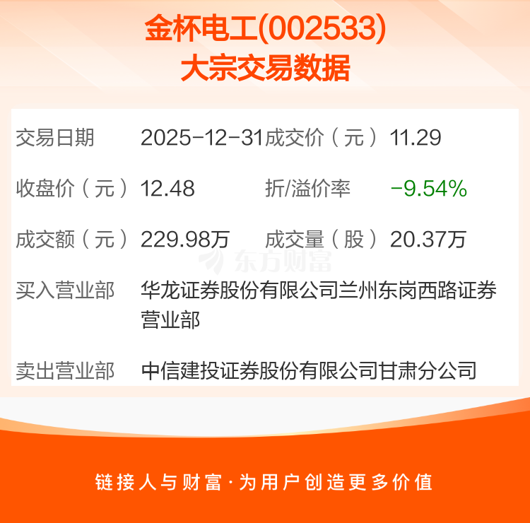 大宗交易:金杯电工成交229.98万元,折价9.54%(12-31)