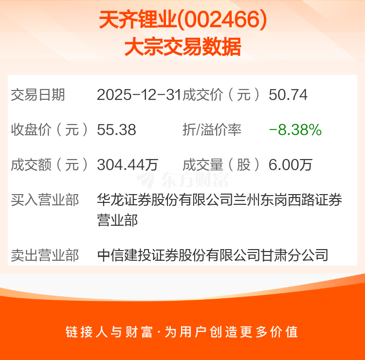 大宗交易:天齐锂业成交304.44万元,折价8.38%(12-31)