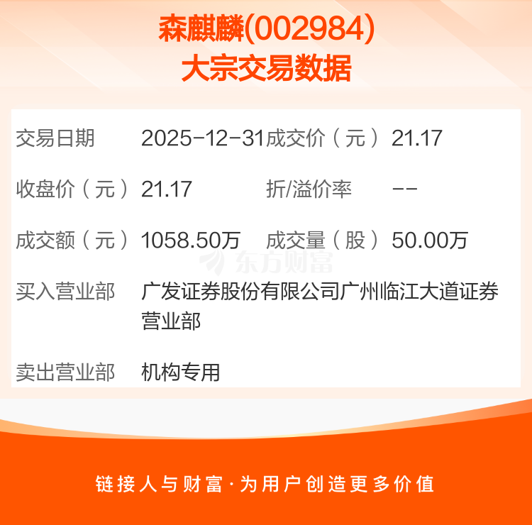 2025年12月31日,森麒麟发生1笔大宗交易,共成交50.00万股,成交金额1058.50万元,占其流通市值比例为0.07%。