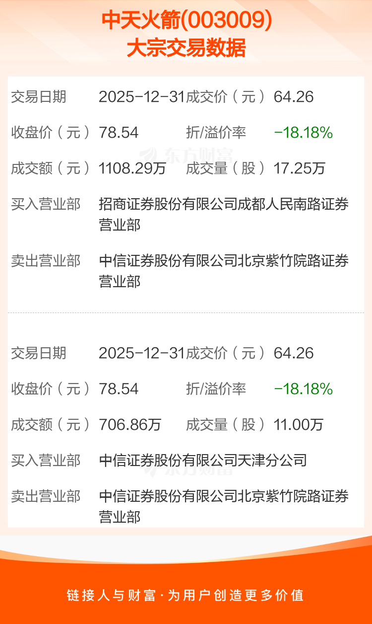 大宗交易:中天火箭成交1815.15万元,折价18.19%(12-31)