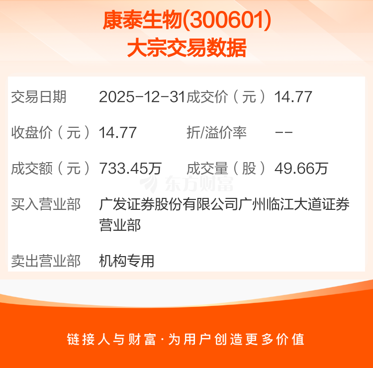 2025年12月31日,康泰生物发生1笔大宗交易,共成交49.66万股,成交金额733.45万元,占其流通市值比例为0.06%。