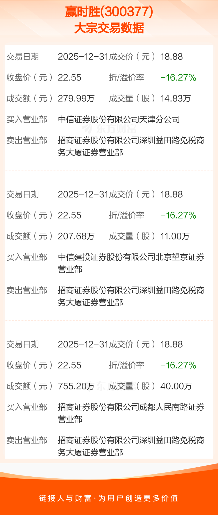 2025年12月31日,赢时胜发生3笔大宗交易,共成交65.83万股,成交金额1242.87万元,占其流通市值比例为0.08%。