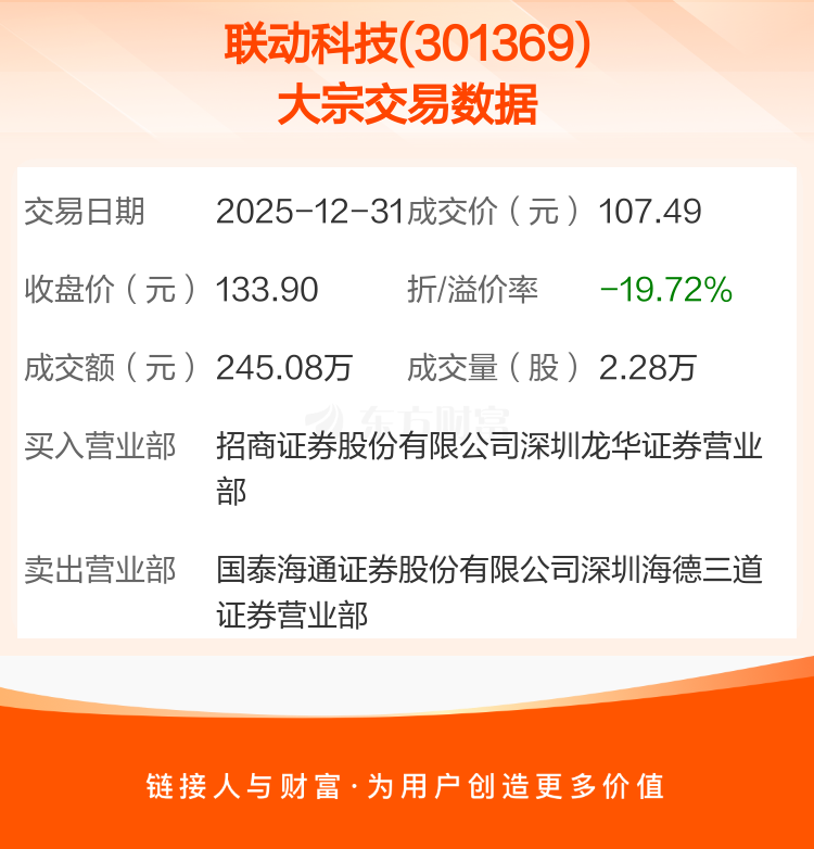 2025年12月31日,联动科技发生1笔大宗交易,共成交2.28万股,成交金额245.08万元,占其流通市值比例为0.05%。