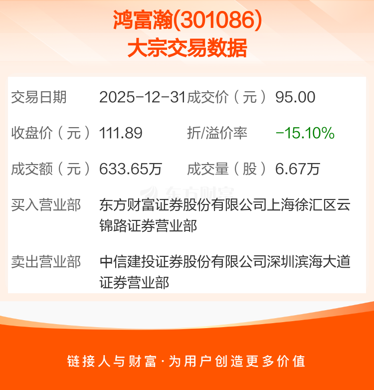 2025年12月31日,鸿富瀚发生1笔大宗交易,共成交6.67万股,成交金额633.65万元,占其流通市值比例为0.12%。