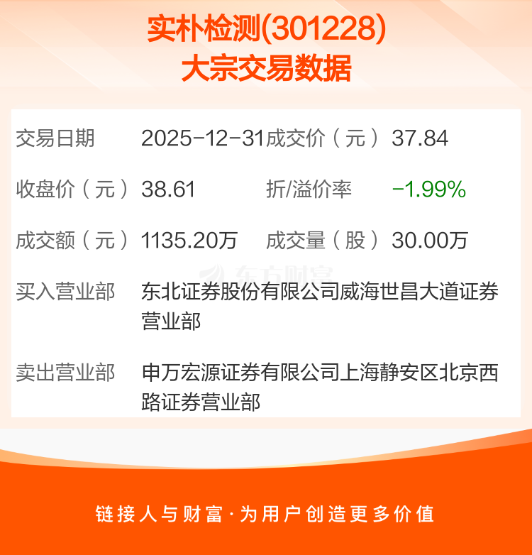 2025年12月31日,实朴检测发生1笔大宗交易,共成交30.00万股,成交金额1135.20万元,占其流通市值比例为0.25%。