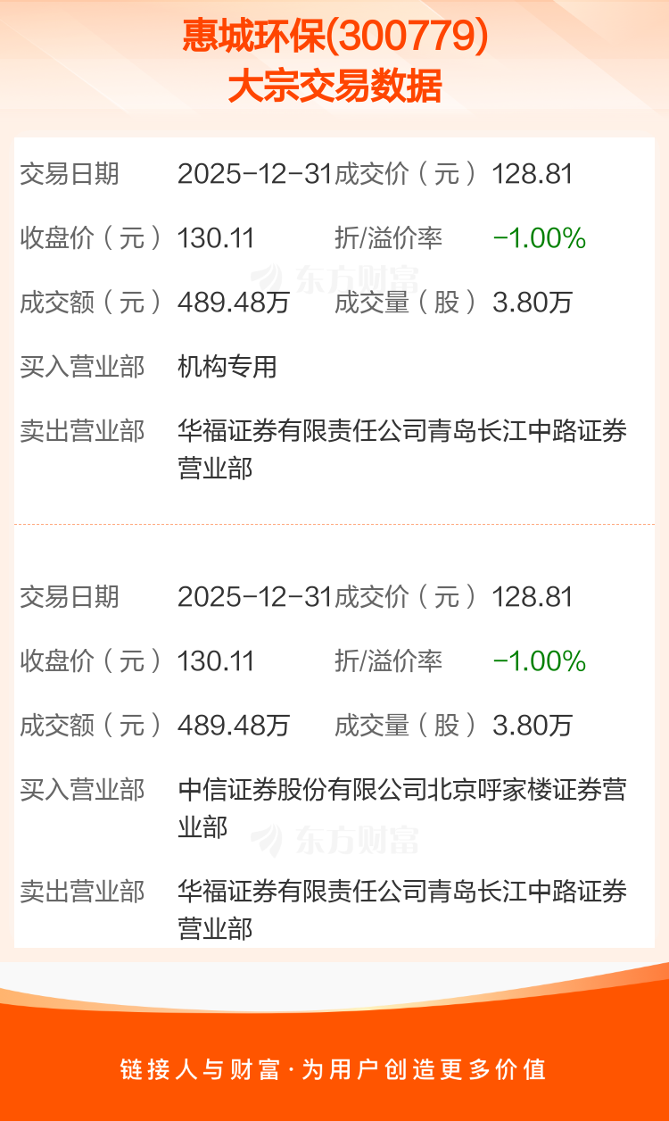 2025年12月31日,惠城环保发生2笔大宗交易,共成交7.60万股,成交金额978.96万元,占其流通市值比例为0.05%。