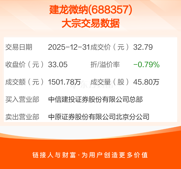 2025年12月31日,建龙微纳发生1笔大宗交易,共成交45.80万股,成交金额1501.78万元,占其流通市值比例为0.45%。