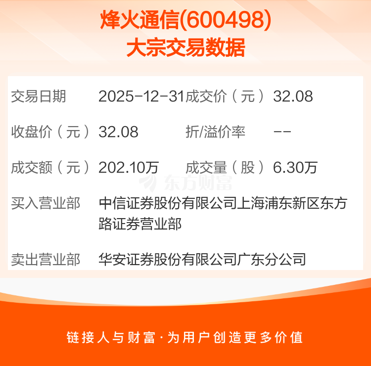 2025年12月31日,烽火通信发生1笔大宗交易,共成交6.30万股,成交金额202.10万元。
