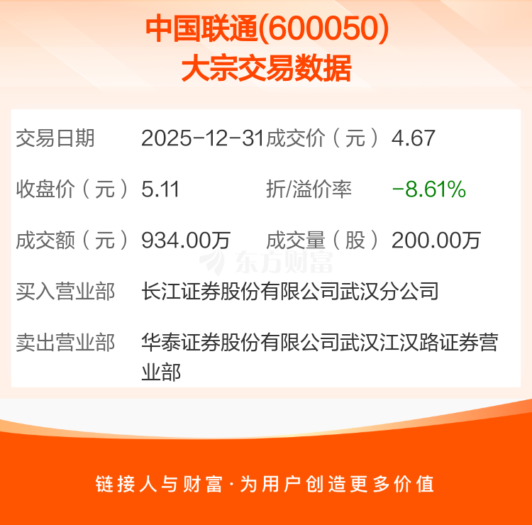 2025年12月31日,中国联通发生1笔大宗交易,共成交200.00万股,成交金额934.00万元。
