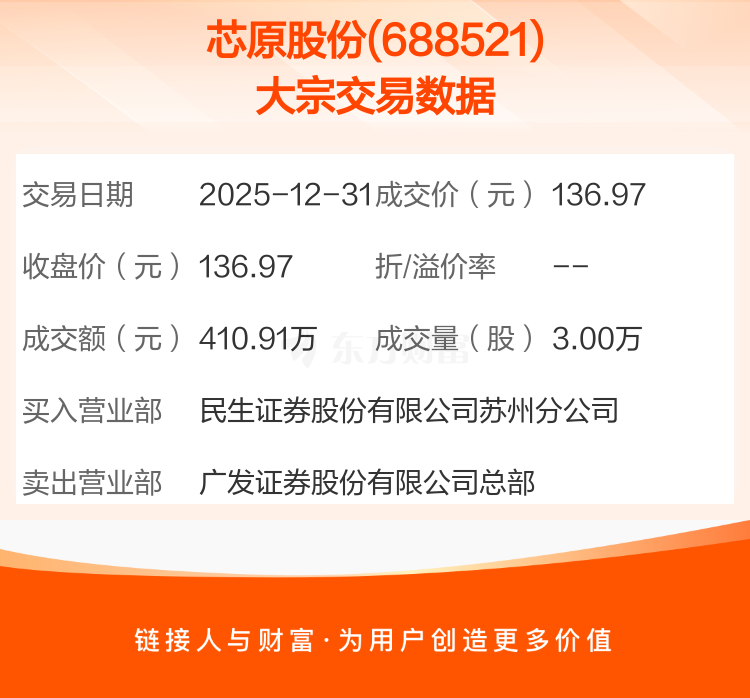 2025年12月31日,芯原股份发生1笔大宗交易,共成交3.00万股,成交金额410.91万元。