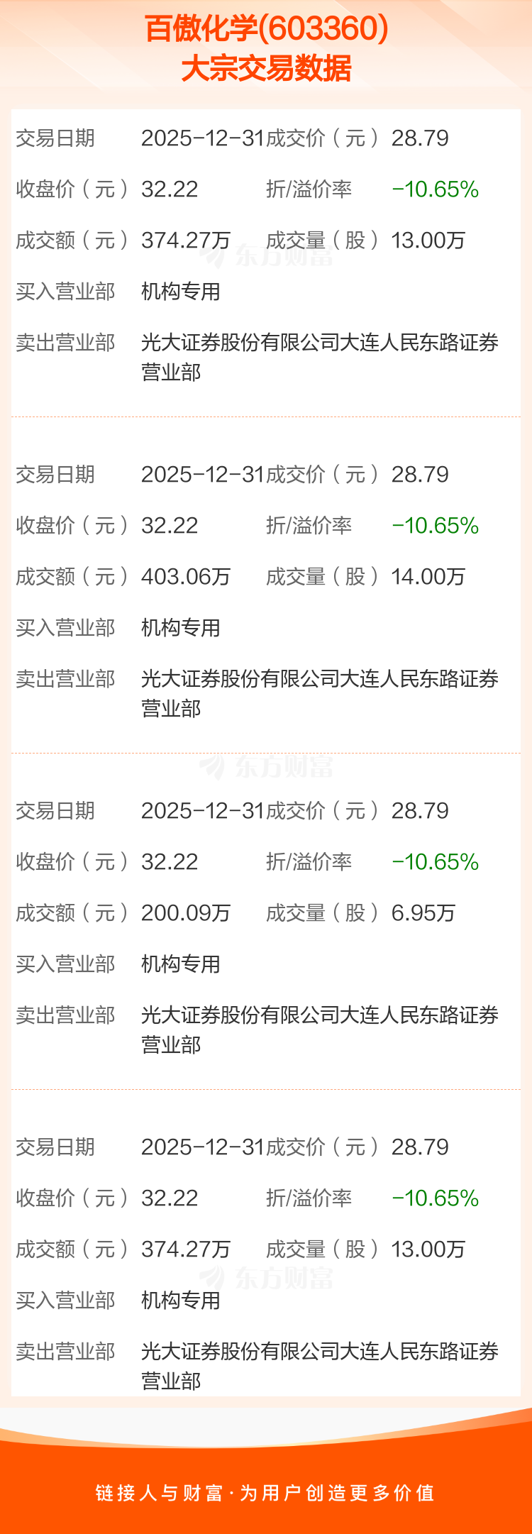 2025年12月31日,百傲化学发生4笔大宗交易,共成交46.95万股,成交金额1351.69万元,占其流通市值比例为0.06%。