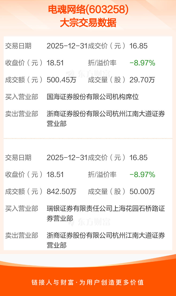 大宗交易:电魂网络成交1342.95万元,折价8.97%(12-31)