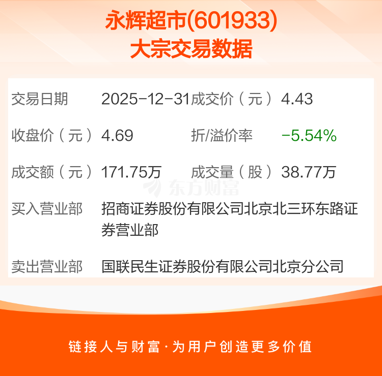 2025年12月31日,永辉超市发生1笔大宗交易,共成交38.77万股,成交金额171.75万元。