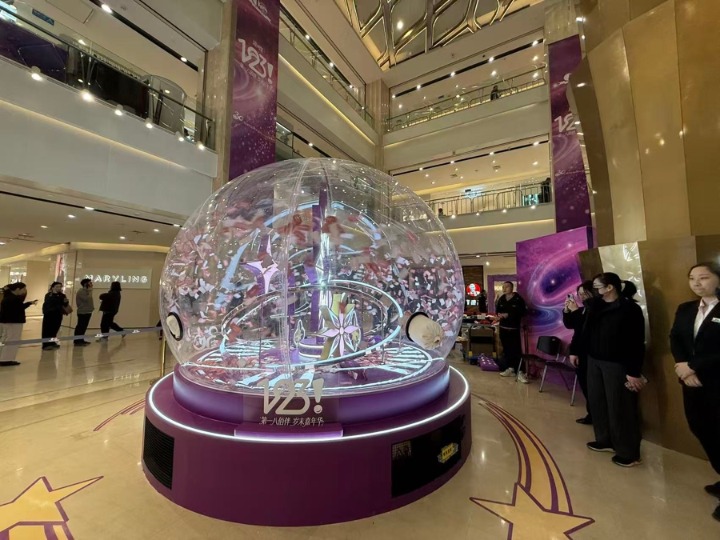 消费者可将手伸进水晶球中,抓取飞舞的星星奖券。 文汇报记者徐晶卉摄