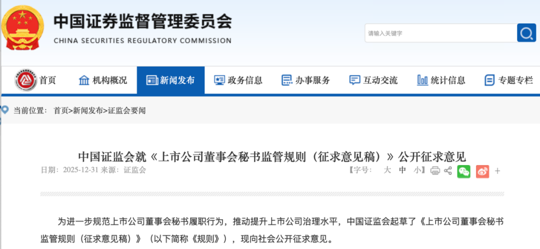 12月31日,中国证监会就《上市公司董事会秘书监管规则(征求意见稿)》(以下简称《规则》)向社会公开征求意见。意见反馈截止时间为2026年1月30日。