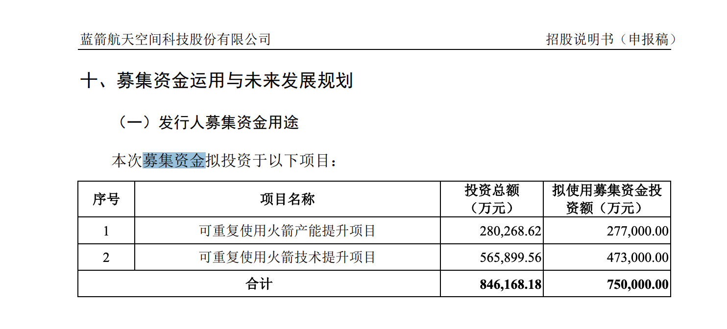 招股书申报稿显示,蓝箭航天IPO拟募资75亿元。蓝箭航天表示,通过本次上市募集资金,大力提升公司可重复使用火箭技术研发、提高发动机与火箭批量化制造能力,充分发挥自身在火箭设计、研发、试验、生产总装、发射的全链条交付能力,实现低成本、大运力、可重复使用火箭的商业化运营,积极响应国家战略规划与迫切的发射服务市场需求。
