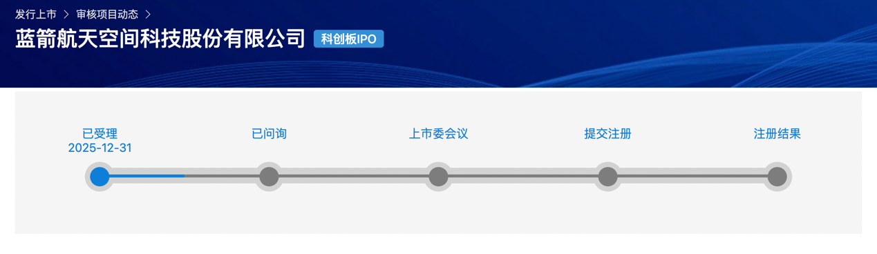 上证报中国证券网讯(记者何昕怡)12月31日,上交所官网显示,蓝箭航天空间科技股份有限公司(简称“蓝箭航天”)科创板IPO申请获受理,正式冲刺科创板“商业火箭第一股”。蓝箭航天此次采用科创板第五套标准申报上市,这也意味着科创板第五套上市标准正式扩大至商业航天领域。