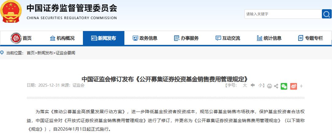 据证监会官网12月31日消息,为落实《推动公募基金高质量发展行动方案》,进一步降低基金投资者投资成本,规范公募基金销售市场秩序,保护基金投资者合法权益,中国证监会对《开放式证券投资基金销售费用管理规定》进行了修订,并更名为《公开募集证券投资基金销售费用管理规定》(以下简称《规定》),自2026年1月1日起正式施行。