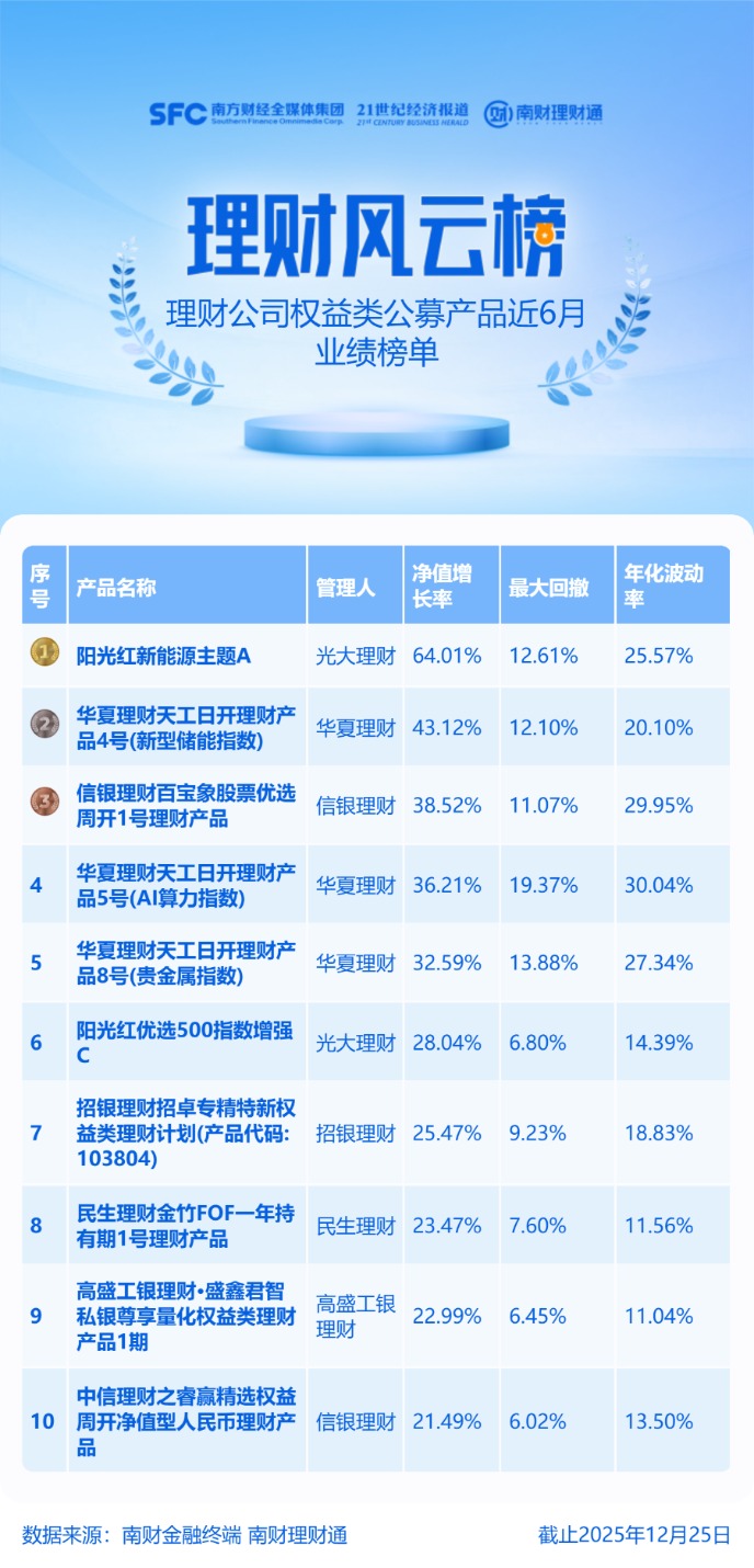 产品统计范围为理财公司权益类理财公募产品,统计截止日期为2025年12月25日,统计区间为近6个月。