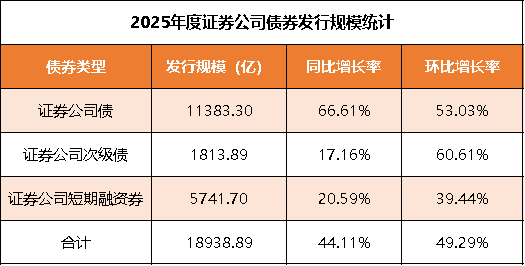 2025年,在流动性持续宽松、行业并购整合加速以及券商资本补充与业务扩张需求多重因素共振下,证券公司债券融资呈现出“量增价优”的鲜明特征。一方面,市场利率维持低位,为券商提供了极具吸引力的发债窗口;另一方面,伴随行业并购重组步伐加快,券商对中长期稳定资金的需求显著上升,债务融资成为支撑并购交易、自营投资及财富管理等核心业务条线扩张的关键工具。在此背景下,全年券商累计发行债券1,004只,总规模突破1.89万亿元,发行数量与发行规模同比增幅均超44%。