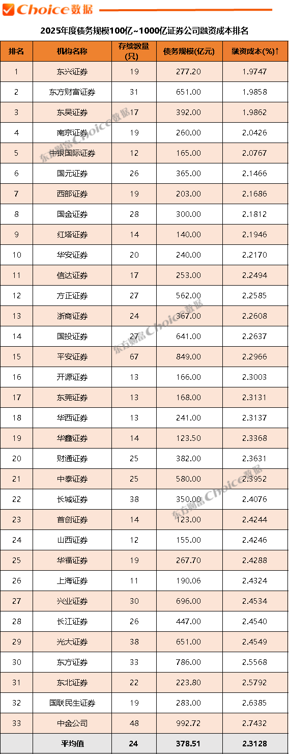 据Choice数据统计,截至2025年12月31日,在债务规模100亿至1000亿区间内共有33家券商,平均融资成本为2.3128%,较三季度进一步下降。东兴证券、东方财富证券、东吴证券包揽前三,融资成本均低于2.00%,展现出在该规模区间内强劲的成本竞争力。