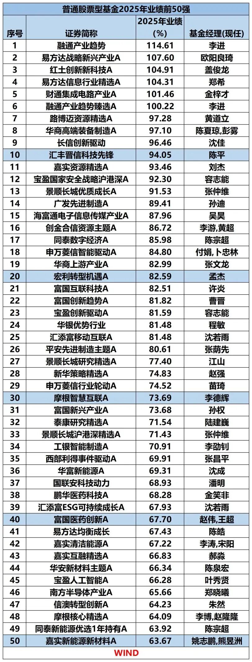 2025年,普通股票型基金平均斩获32.53%的单位净值涨幅,排名前50的普通股票型基金2025年业绩均超60%。