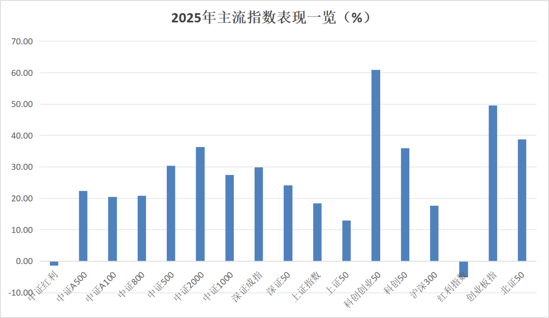 具体来看,主流指数在2025年普遍获得不错涨幅。数据显示,上证指数、深证成指、沪深300指数2025年分别涨18.41%、29.87%、17.66%,科创创业50指数表现较好,涨幅超过60%,达到60.86%。