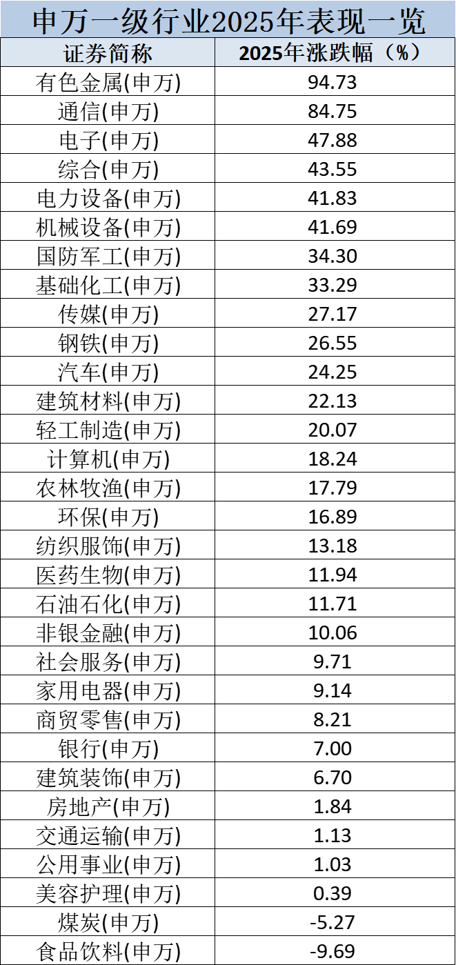 2025年一些行业或者板块表现突出。从板块表现来看,从申万一级行业来看,有色金属业成为2025年表现最好行业,涨幅高达94.73%,通信行业涨幅也高达84.75%,此外,电子、综合、电力设备、机械设备等涨幅也超40%。仅煤炭和食品饮料板块出现下跌,跌幅超过5%。
