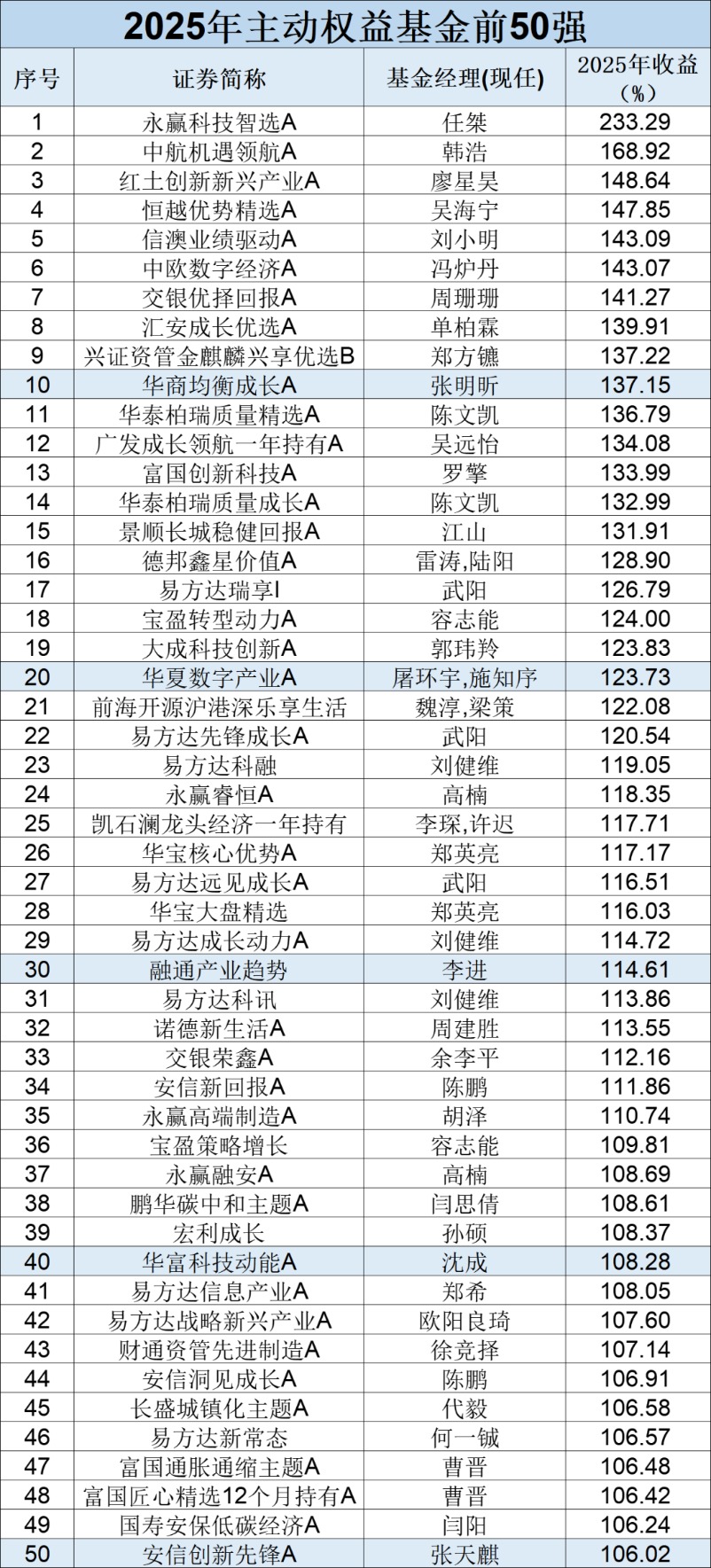 2025年,混合型基金平均斩获26.79%的单位净值涨幅,排名前50的混合型基金均是年度“翻倍基”。