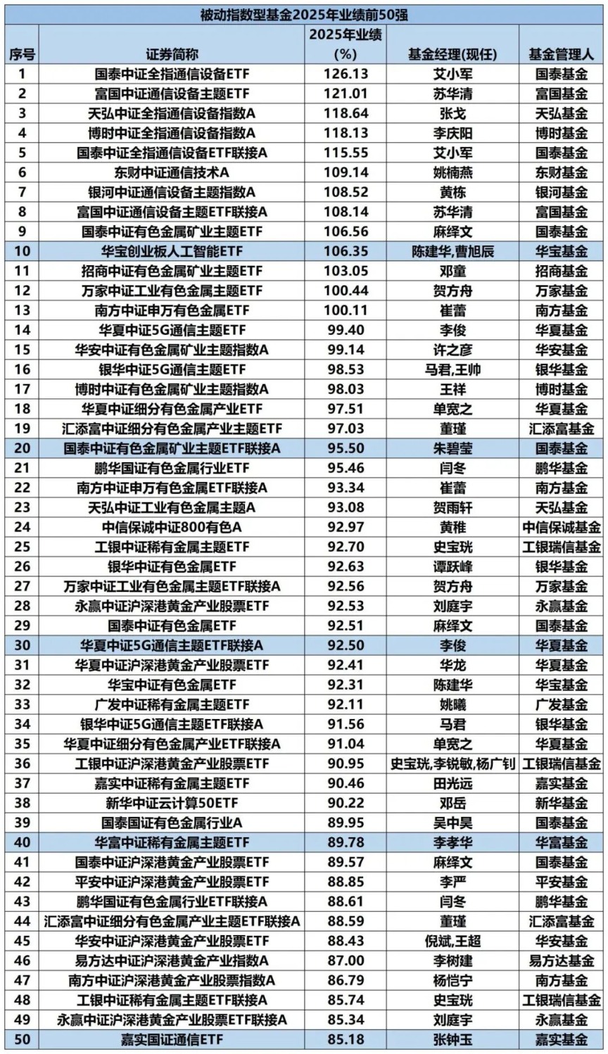 在2025年净值增长率前10只被动指数型基金中,和通信设备相关的产品“霸屏”。其中,国泰中证全指通信设备ETF2025年业绩高达126.13%,位居被动指数型基金业绩第一。