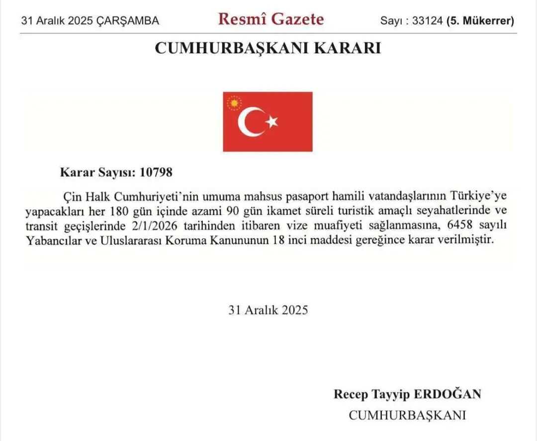 当地时间2025年12月31日,土耳其《官方公报》发布总统令,宣布自2026年1月2日起,对持中国普通护照的公民实行免签入境政策。