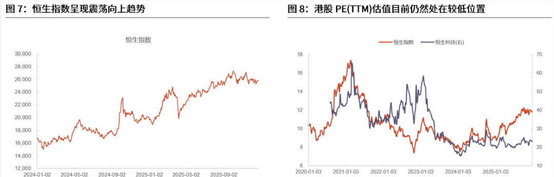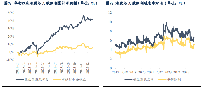 相比 A 股,港股红利的股息率仍更具吸引力。近年国内利率中枢持续下行,国内各类资产的投资回报率预期普遍承压。在此背景下,港股市场的红利资产对于内地投资者具有显著配置价值,尤其是对内地险资等可享受红利税豁免政策的机构投资者而言。年初至今(截至 12 月 26 日)港股红利表现明显优于 A 股,恒生高股息率 R 指数累计上涨 41.9%,而中证红利全收益涨幅为 5.5%。从股息率水平来看,截至 12 月 26 日港股恒生高股息指数的股息率为 6.72%,高于中证红利指数的 5.13%,即使扣除 20%的分红税,港股红利资产经税后的实际收益水平仍优于 A 股同类资产。