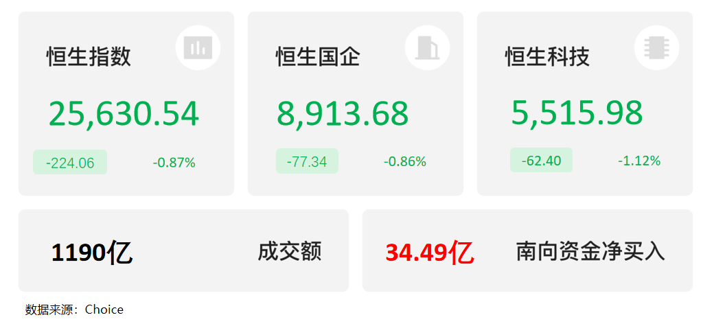 受元旦假期影响,港股下午开始休市,三大指数上午盘集体收跌,收官日表现低迷。恒生指数今日收跌0.87%,全年涨幅达27.77%,创下自2017年以来最佳年度表现;恒生科技指数今日收跌1.12%,全年涨幅达23.45%,创下自2020年以来最佳年度表现。