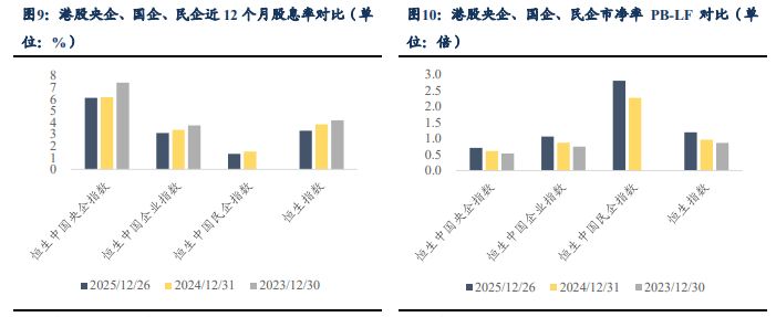 当前央企估值仍处低位,股息吸引力高于国企、民企。港股市场中,央企估值低于国企、民企,截至 12 月 26 日恒生中国央企指数 PB-LF 为 0.7 倍,远低于恒生国企指数的 1.1 倍、恒生民企指数的 2.8 倍,估值洼地特征明显。股息率表现同样体现央企优势,恒生中国央企指数近 3 年股息率维持在 5%以上,显著高于同期国企、民企指数。综合来看,央企无论从配置性价比(低估值)还是投资者回报(高股息)维度,投资逻辑均更为清晰;叠加政策层面对国央企市值管理的持续推进,后续央企价值重估进程值得重点关注。