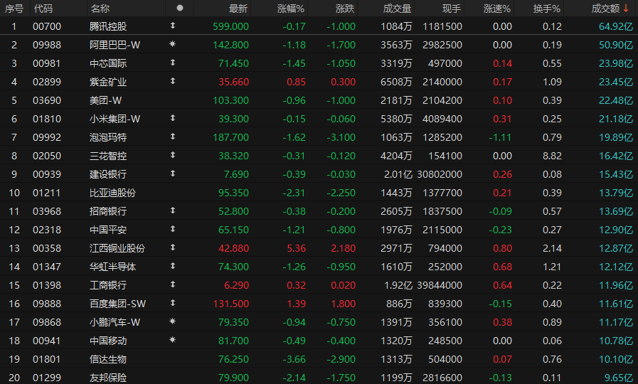 港股成交额前二十
