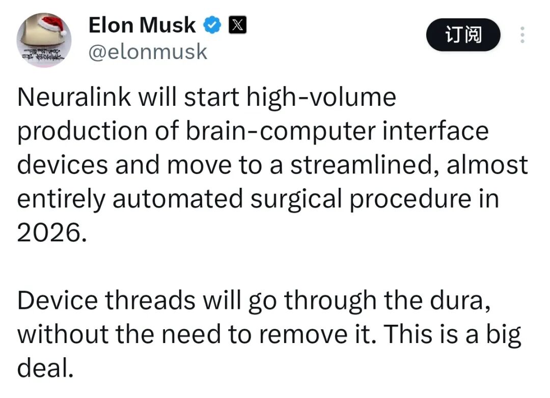 当地时间2025年12月31日,美国企业家埃隆·马斯克在社交媒体上表示,其脑机接口公司Neuralink将于2026年开始对脑机接口设备进行“大规模生产”,并转向“更加精简和几乎完全自动化的外科手术流程”。
