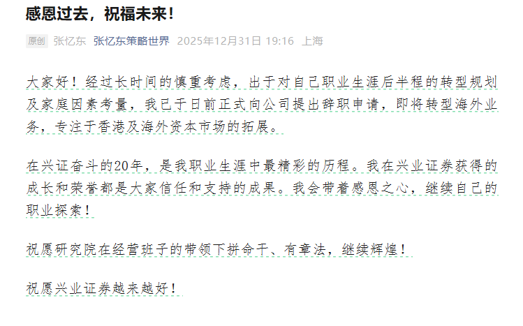 2025年的最后一天,兴业证券全球首席策略分析师张忆东以“感恩过去,祝福未来!”为题发文,官宣离任。