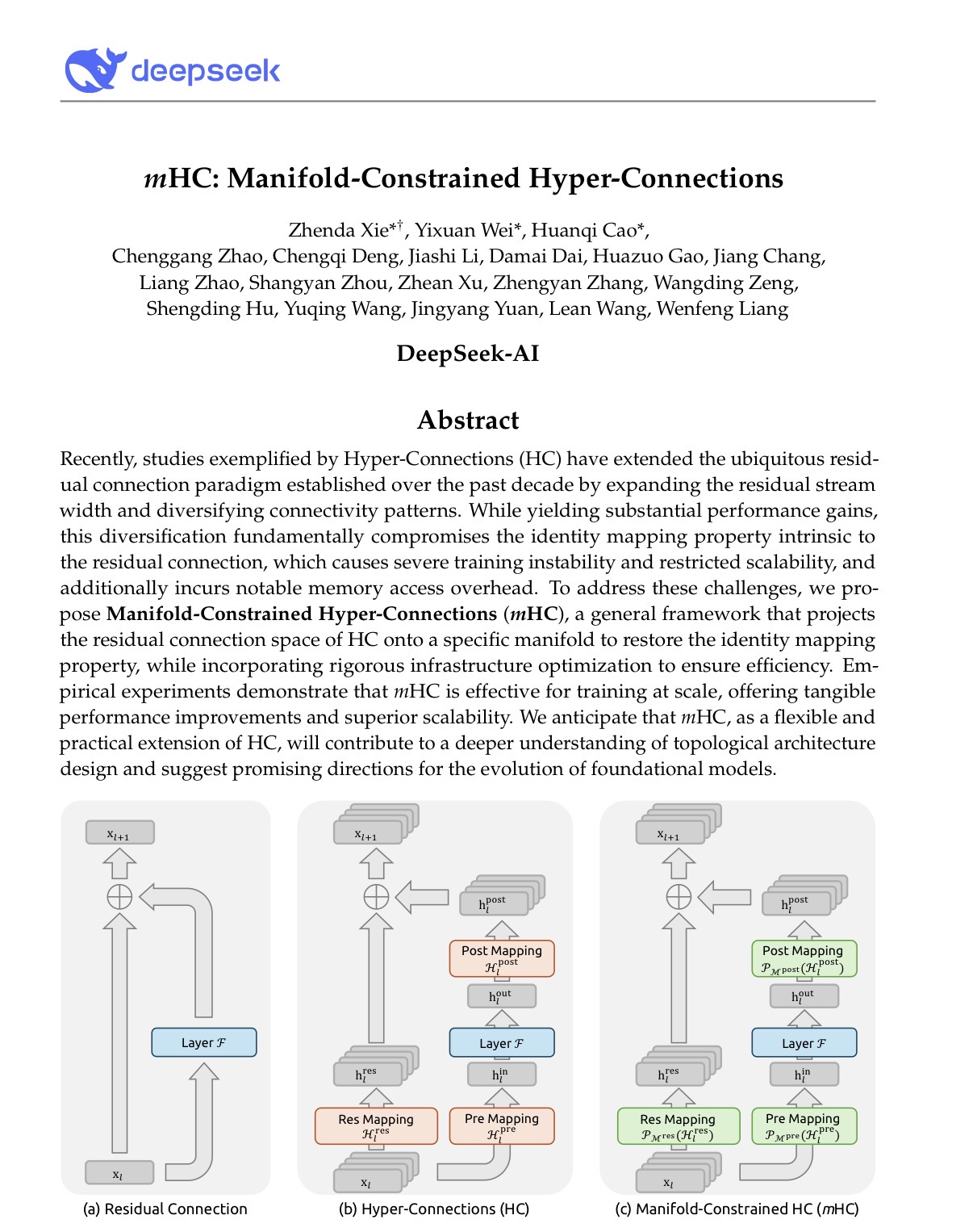 新论文名为《mHC :Manifold-Constrained Hyper-Connections》(《mHC:流形约束超连接 》),DeepSeek创始人兼CEO梁文锋出现在了合著名单之中,而解振达(Zhenda Xie)、韦毅轩(Yixuan Wei)、曹焕琪(Huanqi Cao)则是核心贡献者。