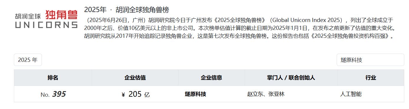 根据《2025年胡润全球独角兽榜》,燧原科技以205亿企业估值位列榜单第395位。