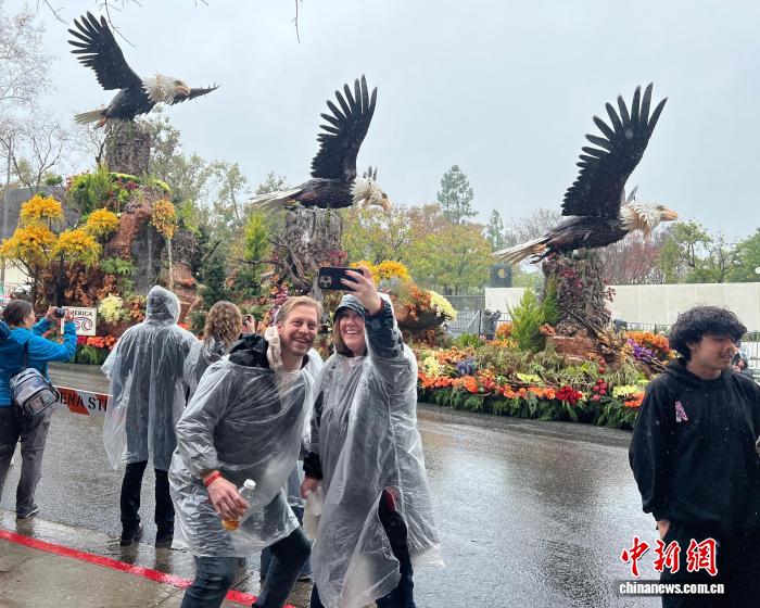 当地时间1月1日,第137届玫瑰花车游行在美国加利福尼亚州帕萨迪纳市举行,人们在雨中迎接新年的到来。图为人们同美国建国250周年主题花车合影留念。中新社记者张朔摄